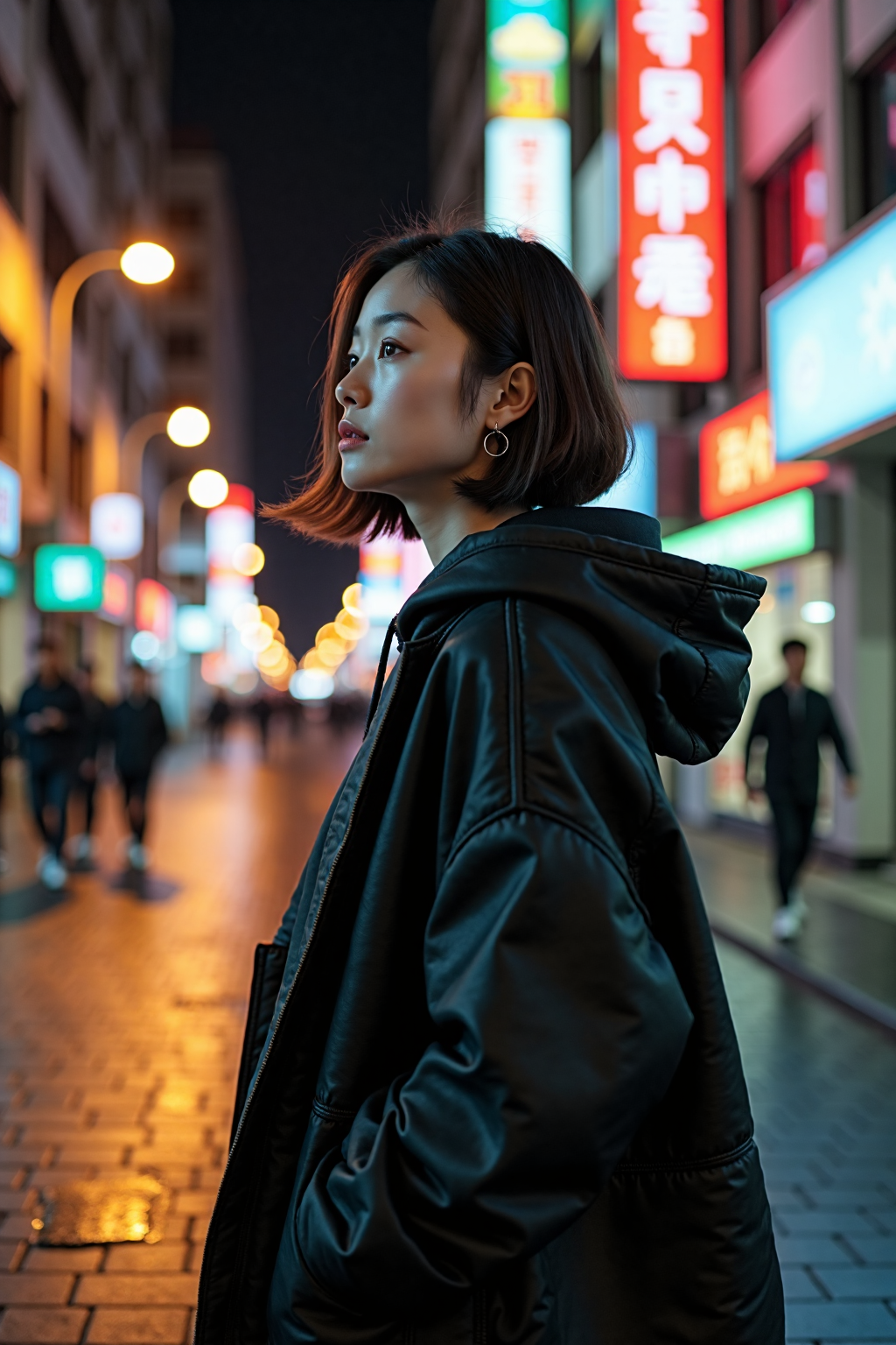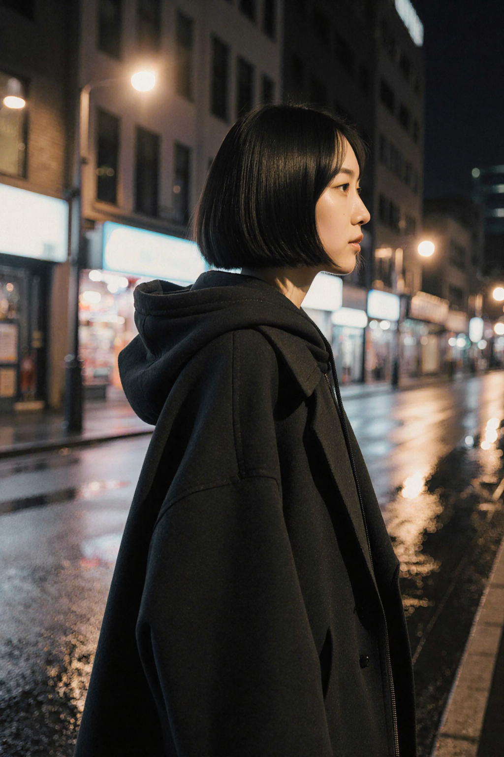 '시크한 얼굴로 밤거리를 걷고있는 젊은 여성의 옆모습'입니다.