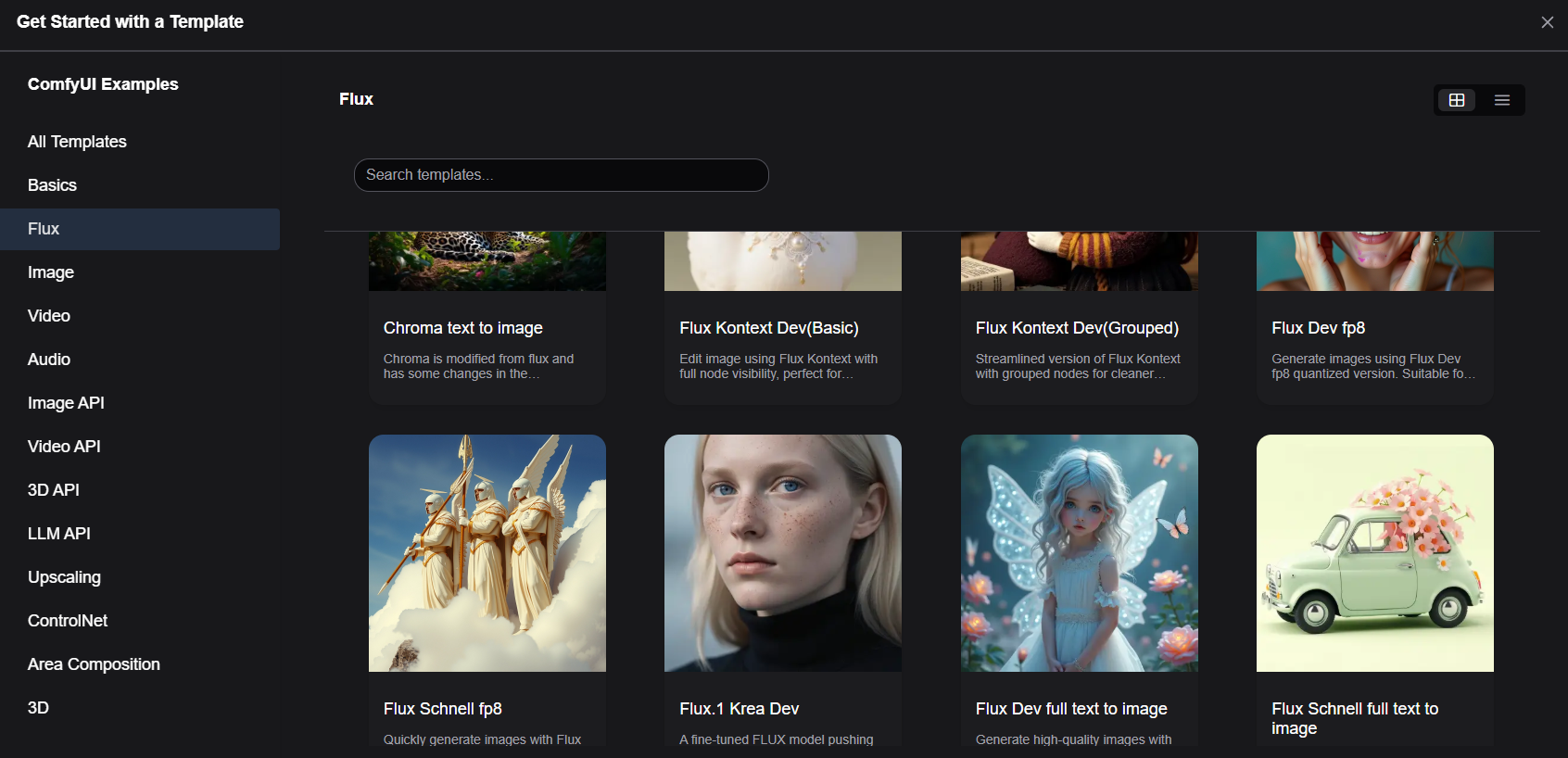 comfyUI Browse Templates 서비스에 접속하시면 Flux탭에 있습니다.
